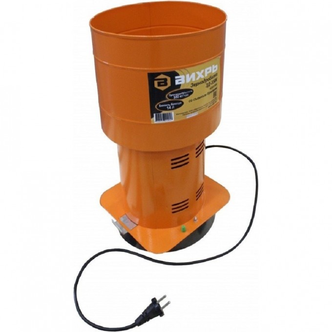 Модель зернодробилки ВИХРЬ ЗД-350К оснащена электродвигателем мощностью 1350 Вт, работающим от бытовой электросети 220В, и круглым бункером увеличенного объёма – 14 л. Частота вращения ножа – 1200 об/мин.